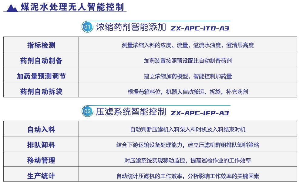 借助各類高精度傳感器,實時監(jiān)測煤泥水的流量、濃度,溢流水濁度,澄清層高度等關(guān)鍵指標(biāo),建立干粉自動添加、藥劑智能配制加藥模型,實現(xiàn)根據(jù)生產(chǎn)煤泥水濃度、流量變化改變加藥量;同時利用拆包機器人解決干粉的搬運、拆包以及補充,實現(xiàn)濃縮加藥全流程的無人值守。智能加藥算法準(zhǔn)確率大于98%,加藥量降低3%。