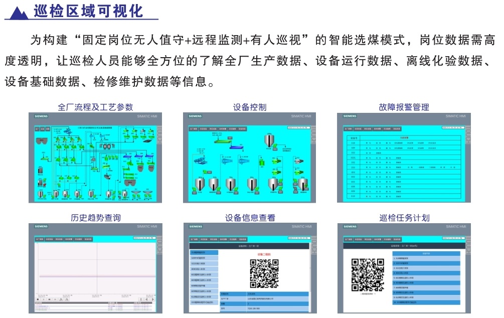 產(chǎn)品簡(jiǎn)介:構(gòu)建“固定崗位無(wú)人值守+遠(yuǎn)程監(jiān)測(cè)+有人巡視”的智能選煤模式,崗位數(shù)據(jù)需高度透明,我公司提出用觸摸屏代替?zhèn)鹘y(tǒng)控制箱,通過(guò)觸摸屏與管控平臺(tái)的對(duì)接,讓巡檢人員能夠全方位的了解全廠生產(chǎn)數(shù)據(jù)、設(shè)備運(yùn)行數(shù)據(jù)、離線化驗(yàn)數(shù)據(jù)、設(shè)備基礎(chǔ)數(shù)據(jù)、檢修維護(hù)數(shù)據(jù)等信息。建立智能啟停車診斷系統(tǒng),充分利用集控系統(tǒng)、配電系統(tǒng)、視頻分析系統(tǒng)、設(shè)備預(yù)測(cè)性維護(hù)系統(tǒng)、檢修任務(wù)進(jìn)度等信息,建立啟停車前人機(jī)環(huán)境評(píng)估、生產(chǎn)過(guò)程異常數(shù)據(jù)分析以及發(fā)現(xiàn)問(wèn)題后的消息推送與執(zhí)行策略。